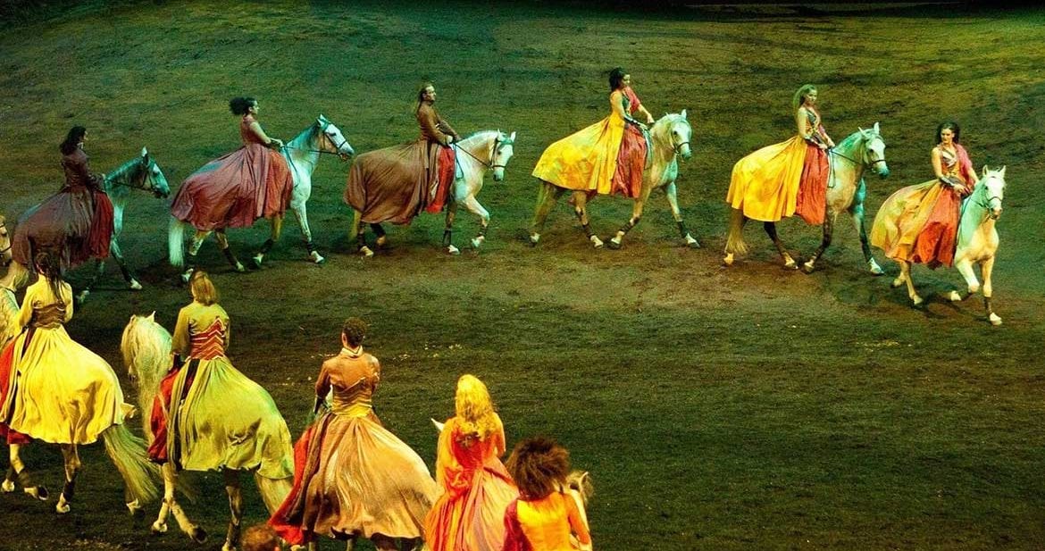 Each act had a theme with appropriate lighting, live music, and effects. One featured spotlights that shined on a sheet of water coming down in the middle of the stage that portrayed a silhouette of a horse running and playing. A real horse would alternate with it, coming in and out of the darkness in time with the silhouette.