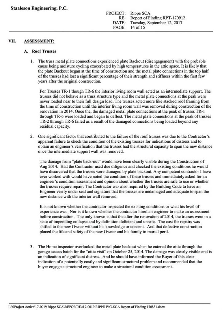 When the problem was discovered in June, I immediately hired a civil engineer to perform an inspection of the structure. Due to the cost of that inspection, you will not be privy to that report. That report, however, states that the failure of the trusses is a direct result of the interior walls that were removed.